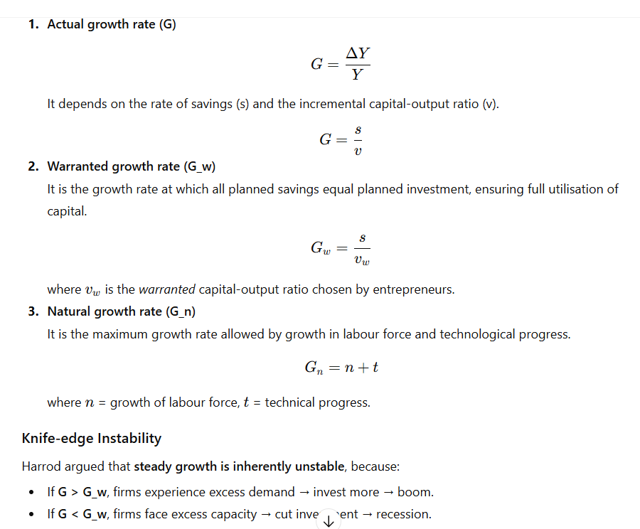 Harrod’s growth model (also called the Harrod-Domar model) is a dynamic Keynesian model that examines the conditions required for an economy to achieve steady growth. It emphasises the knife-edge instability of the growth process.