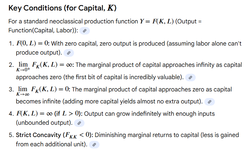 Inada conditions are mathematical assumptions for production functions (like $Y=F(K,L)$) in economics, named after Ken-ichi Inada, ensuring smooth behavior and stable growth equilibria.